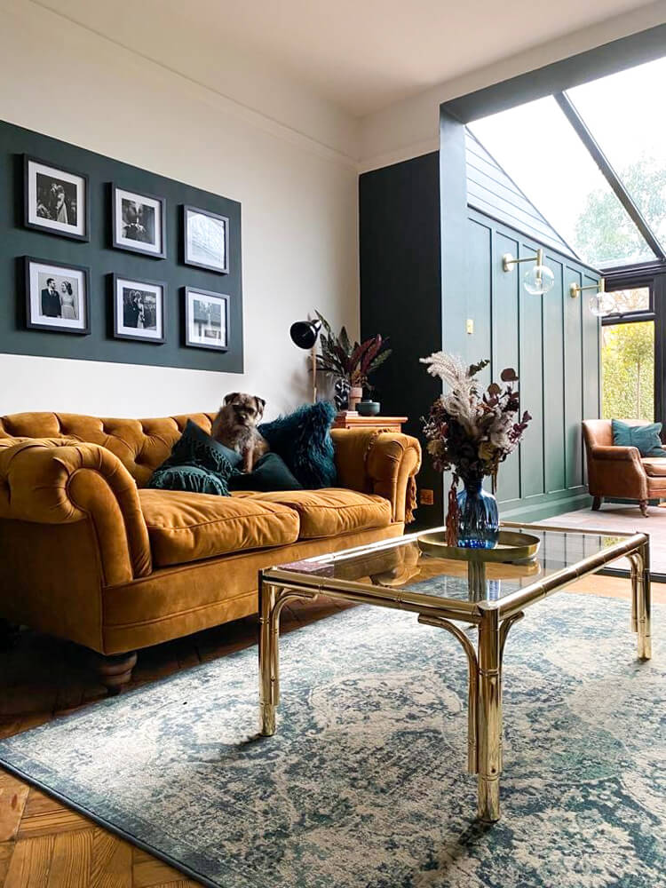 Repeat the kitchen color scheme with softer textures in an adjacent sitting area.